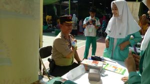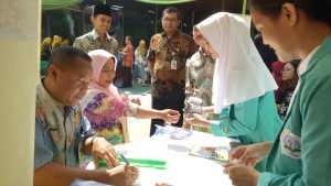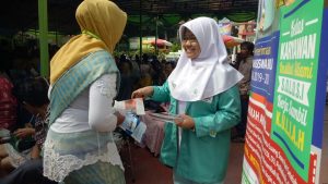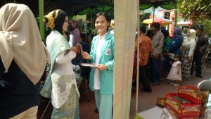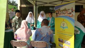Stand pendidikan pendaftaran mahasiswa baru dan pemeriksaan tensi darah gratis di acara pelepasan siswa SMK Sejahtera Jakarta Utara, Kamis 20 Juni 2019.